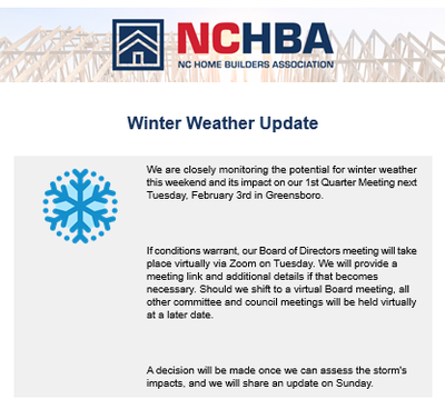 Due to wintry weather affecting safe travel for our members across the state, NCHBA's Senior Officers have decided to cancel our 1st Quarter Meeting in Greensboro.